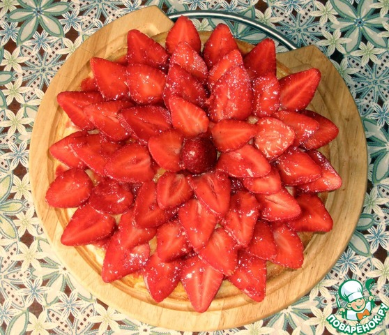 Нарезаем клубнику пластинками, выкладываем на корж.