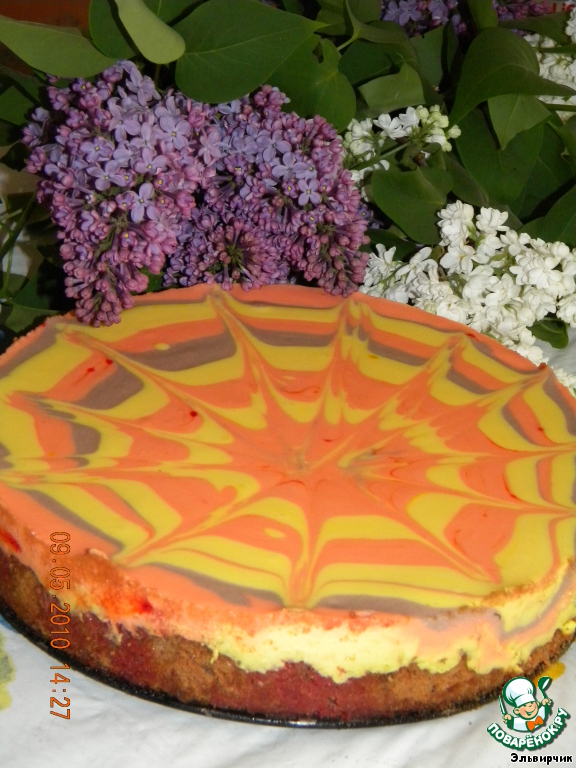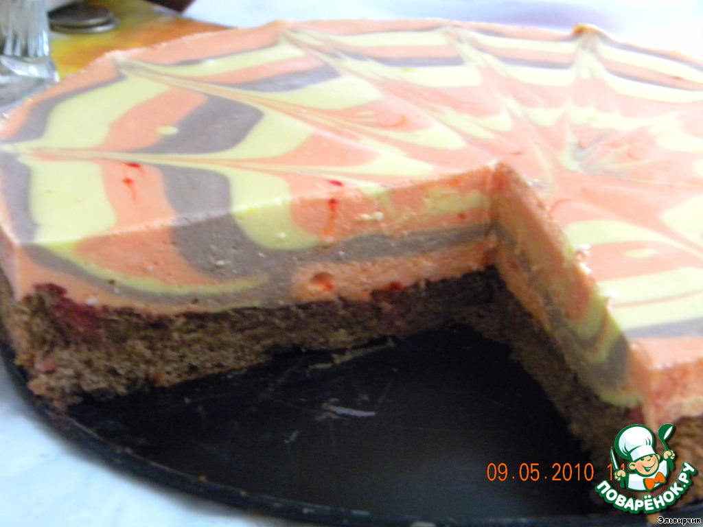 Самое интересное... На середину бисквита выливаем 4 ст.л. начинки одного цвета, 4 ст.л. второго цвета и 4 ст.л. третьего цвета - и так, пока не закончится масса.