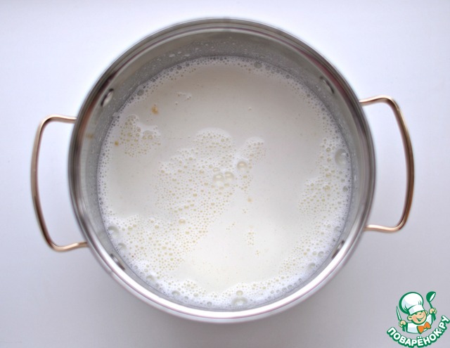 Ванильно-молочное желе: Желатин распустить в 50 мл молока. Остальное молоко (450 мл) слегка прогреть, добавить сахар (120 г), ваниль (1 г). Хорошо размешать, до полного растворения сахара. Добавить распущенный желатин (15 г). Смешать. Дать остыть.