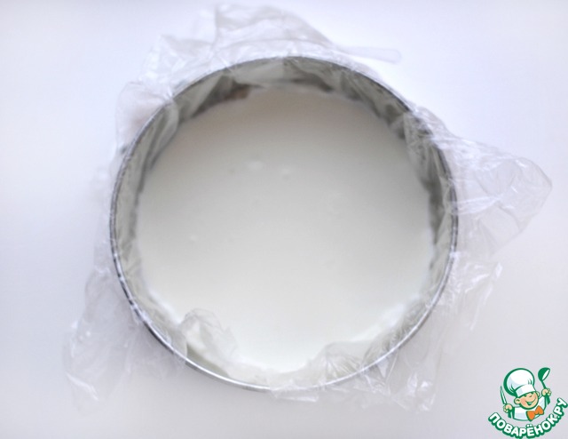 Форму диаметром 18 см застелить пищевой пленкой. Влить на дно формы часть желе, примерно 1-2 см. Поставить в холод, дать застыть.