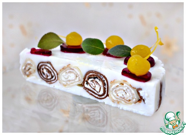 Готовим крем для блинных рулетов: Перемешать маскарпоне (250 г) с сахарной пудрой (80 г). Сливки 33% хорошо взбить, аккуратно смешать с маскарпоне. Крем готов. Сборка блинных рулетов: 4 шоколадных и 3 светлых блина намазать кремом, свернуть рулетом. Края подрезать по форме. Сборка торта: Поверх застывшего желе уложить блины, чередуя светлый и темный. Залить остатками желе. Поставить в холод до полного застывания.