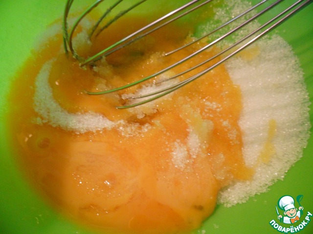 Желтки отделяем от белков. В желтки всыпаем сахар и хорошенько перетираем добела, чтобы сахар почти растворился. Можно сделать это с помощью миксера.