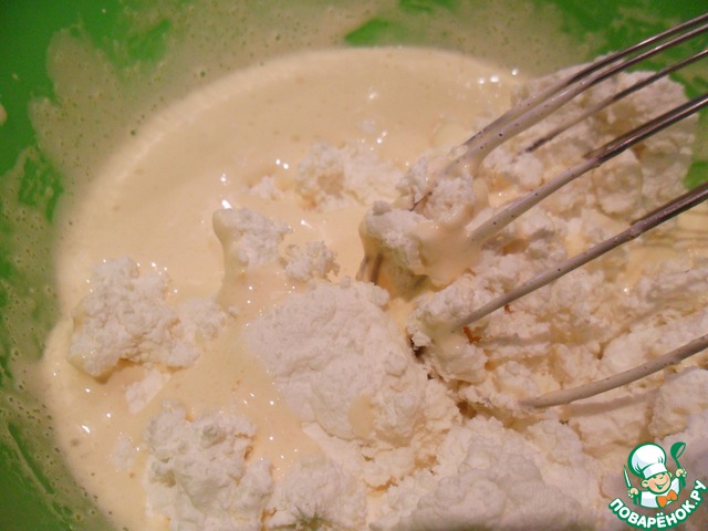 В желтковую смесь выкладываем творог и перемешиваем миксером.