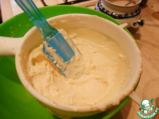 Если творог с крупинкой, то эту массу лучше протереть через сито. Можно, конечно, и заранее перетереть творог через сито, но мне нравиться протирать такую чуть жидковатую массу - она легче проходит через сито и получается быстрее.