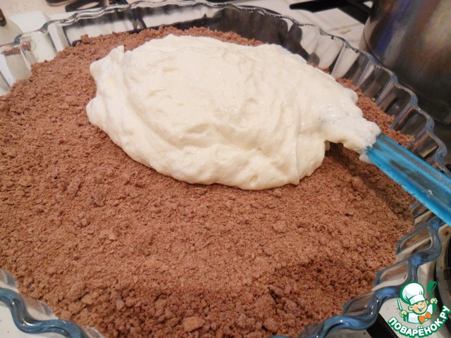 Ну а дальше все просто - собираем наш пирог - укрываем дно формы 2/3 штрейзеля и выкладываем на него творожный крем, хорошенько разравниваем прослойку.