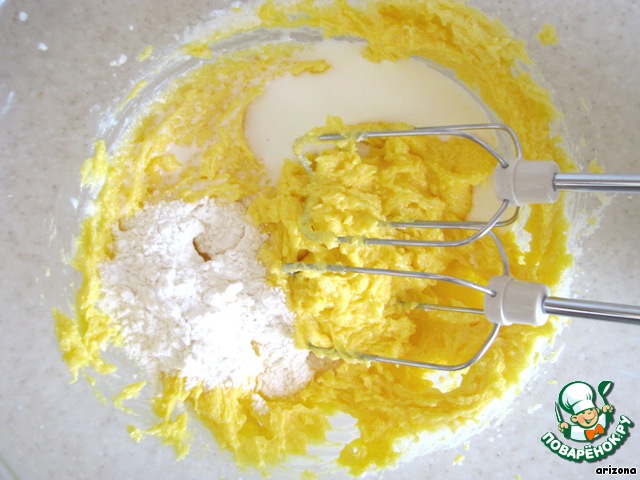 Муку просеять с разрыхлителем и постепенно вмешать во взбитую массу вместе с молоком.