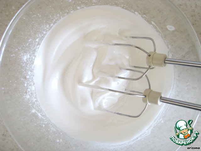 Хорошо охлажденные яичные белки (2 шт.) взбить в крепкую пену со щепоткой соли, постепенно всыпать 100 г сахарной пудры.
