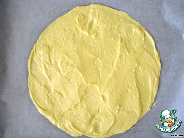 Половину теста выложить лопаткой в смазанную жиром разъемную форму (26 см), равномерно распределить и поставить в духовку на 10 минут.