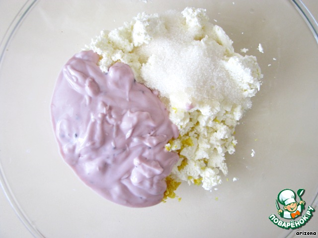 Творог (у меня домашний) смешать с йогуртом (можно взять любой фруктовый йогурт или натуральный без добавок), сахарным песком, соком и цедрой половины лимона.