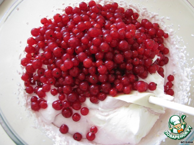 Красную смородину вымыть, удалить веточки. Сливки взбить. Когда крем начнет застывать, соединить его со смородиной и взбитыми сливками (я это сделала сразу).
