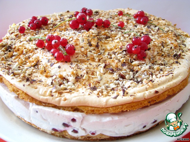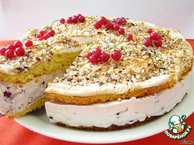 Выложить взбитые белки на готовый корж, посыпать грецкими орехами и поставить в духовку еще на 20-25 минут. Белковая масса подрумянится, поднимется, потом слегка осядет, на вкус будет нежной. Если хотите получить хрустящее безе, температуру в духовке следует уменьшить до 120 градусов и увеличить время выпечки. Я непременно повторю этот торт с другой ягодой в таком варианте и выберу для себя оптимальный).
