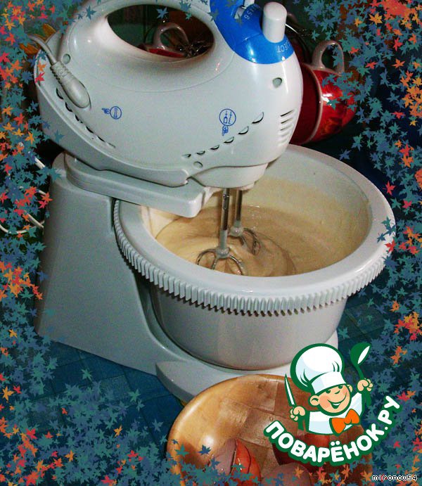 В подошедшую опару добавляем яйца растопленное сливочное масло, 100, граммов меда… Хорошенько все взбиваем, до образования однородной пенной массы. Делим примерно пополам, для темного и белого теста .