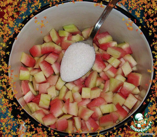 Пока готовится тесто, займемся арбузом… Срежем отдельно сердцевину и мякоть, с корок срежем наружную, зеленую, твердую кожуру, нарезаем все на дольки 1х1 сантиметр, добавить 200 гр. меда и немного сахара, ставим вариться на маленький огонь, помешивая, до полной готовности медовых цукатов. Замачиваем 100 гр. пищевого желатина в двух стаканах теплой воды и ставим на паровую баню, до полного растворения желатина
