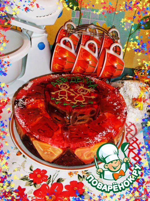По внутреннему периметру надписи сворачиваем из промасленного ватмана бумажный цилиндр высотой чуть выше размера букв, закрепляем края цилиндра степлером , чтоб не раскручивался, устанавливаем на творожном основании, внутри цилиндра выставляем буквы надписи и заполняем пустоту арбузными кубиками с ананасом и заливаем заранее приготовленным арбузно- медовым желе, которое готовим следующим образом: Отжатый и профильтрованный арбузный сок смешать со 150 граммами меда и второй оставшейся половиной растворенного желатина, чтобы цвет был более насыщенным можно добавить сироп черной смородины… Только не совершите ошибку допущенную мной… Дайте немного застыть желе , и уже подзастывшим заполняйте пустоту . слишком жидкое желе просочилось и залило буквы текста, что было совсем не желательно. Ставим торт на ночь в холодильник, а утром достаем, снимаем разъемную форму, бумажное кольцо, разрезав его ножницами в нескольких местах… На самом верхнем основании торта наносим забавный рисунок цветной карамелью из шприца и несем быстренько в школу к традиционному чаепитию ,посвященного открытию нового театрального сезона!!!