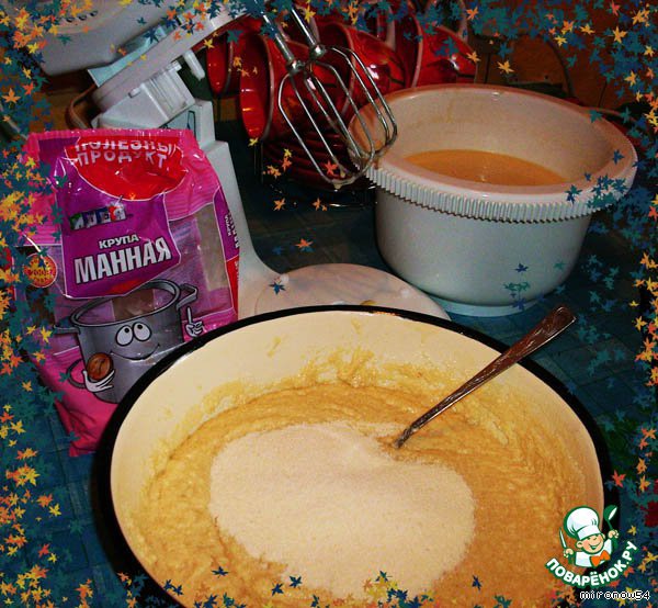 Поверх цукатов и ананасов выкладываем часть испеченных букв и печений, сверху пропитываем цукатным медком и заливаем тонким слоем творожно –сливочной массой которую готовим следующим образом: Мелко раскрошить 2 пачки творога, добавить три стакана сливок, стакан меда и половину оставшегося, остывшего желатина. Взбиваем все в густую пену.