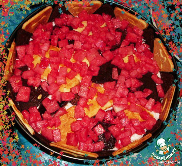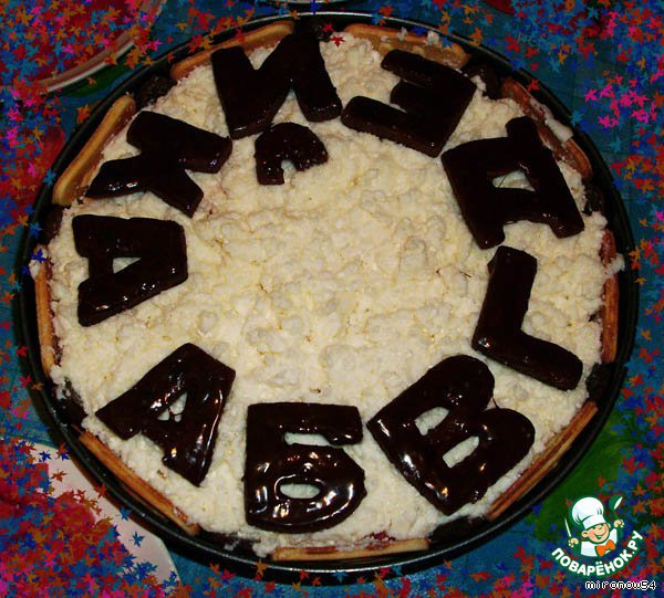 Поверх сливочно-творожной заливки выкладываем очередной слой печений, вперемешку темные и светлые. Поверх печений выкладываем маленькие кубики арбузной сердцевины и заливаем цукатным медком… потом опять творог со сливками и поверх покрытые шоколадом испеченные буквы.