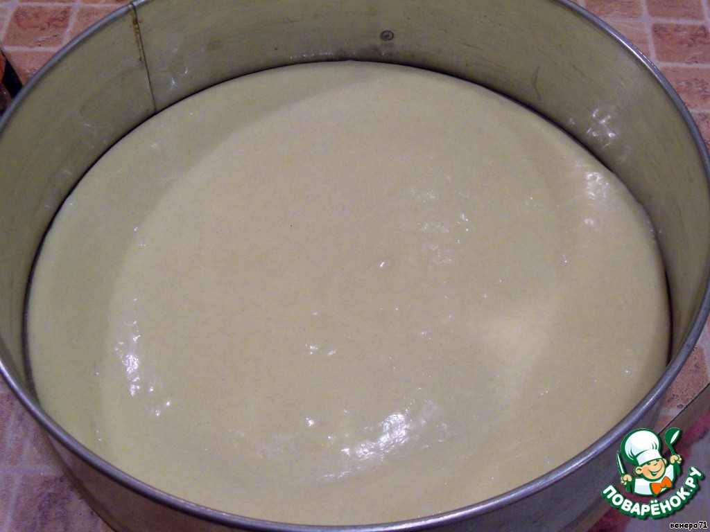 Делаем корж: яйца взбить с сахаром, добавить молоко, муку, крахмал, разрыхлитель, перемешать и добавить растопленное сливочное масло. Хорошо размешать и вылить в форму.