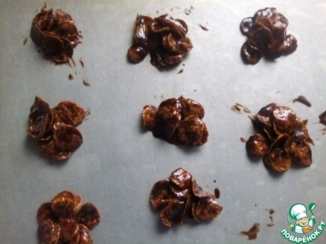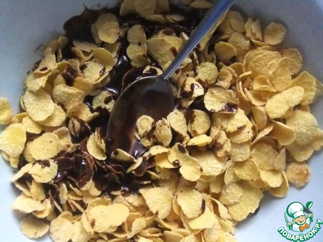 Время приготовления указано без учета времени застывания торта. Сливочное масло и шоколад растопить на водяной бане, добавить кукурузные хлопья, тщательно размешать.