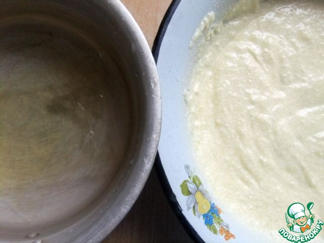 Тем временем приготовить начинку: Желатин замочить в холодной кипяченой воде. Сахар растереть с желтками, добавить лимонный сок и творог, протертый через сито, чтобы в нем не было крупинок. Все перемешать.