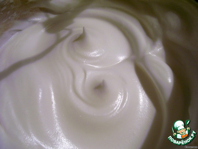 Достаем белки из холодильника и взбиваем с остатком сахара до пышности.