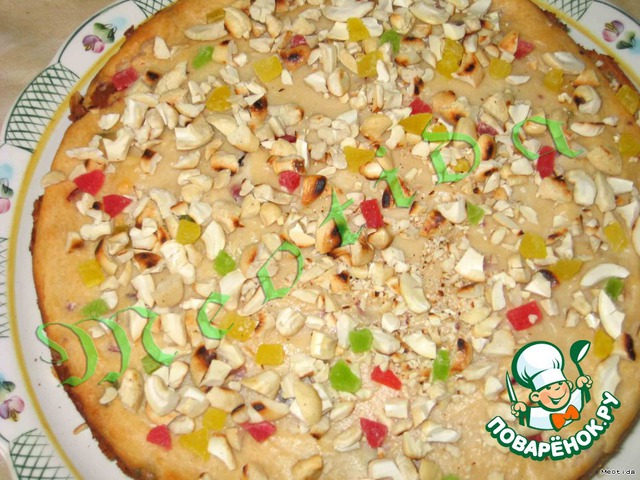 Выложить на корж половину творожной массы и посыпать 3/4 стакана цукатов.