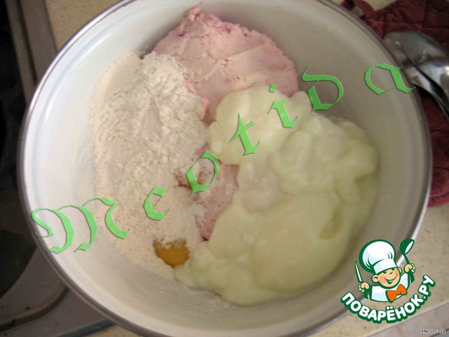 муку, желтки, йогурт, ванилин, творог, творожную сладкую массу - хорошо взбить миксером.