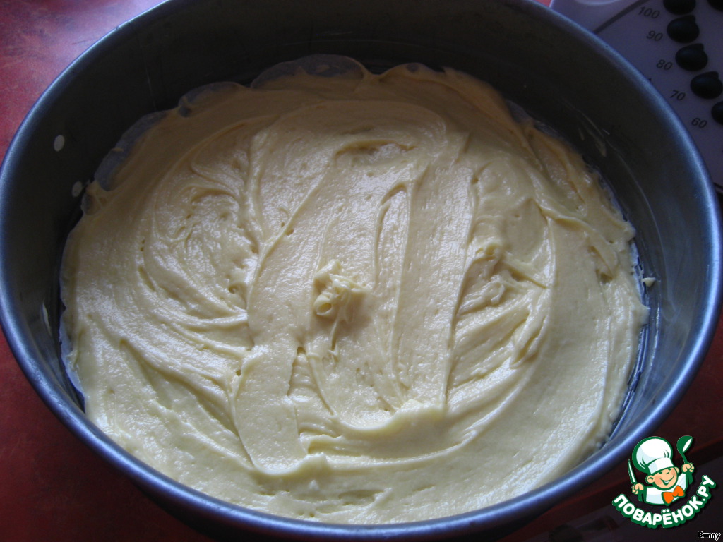 Половину теста выложить в промазанную маслом или выложенную бумагой разъёмую форму (26см).