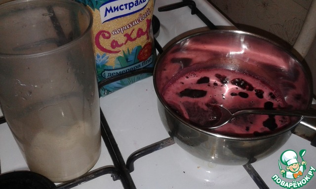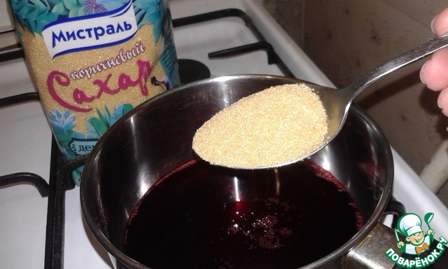 Для крема в вишневый сок высыпаем 1 столовую ложку тростникового сахара и доводим до кипения