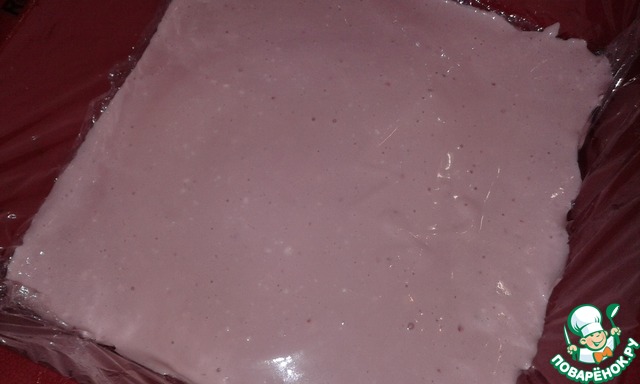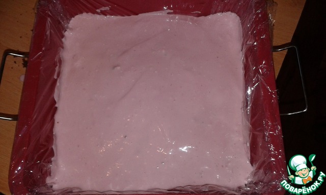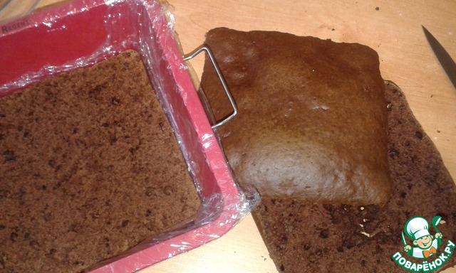 Готовый корж разрезаем на 2 части и с верхней срезаем поднявшуюся "шапочку", чтобы коржи были ровными. Форму выстилаем пищевой пленкой (или используем разъемную форму) и укладываем первый корж