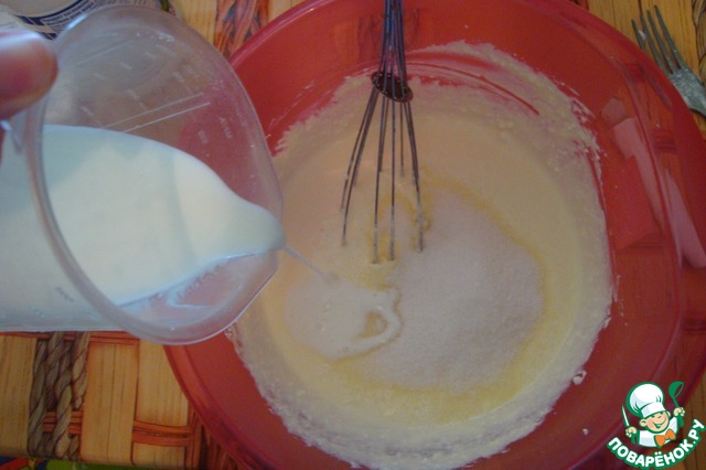 После влить йогурт и добавить сахар.