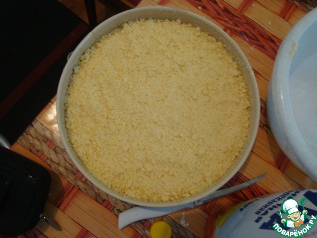 Форму смазать сливочным маслом. На дно формы выложить половину крошки.