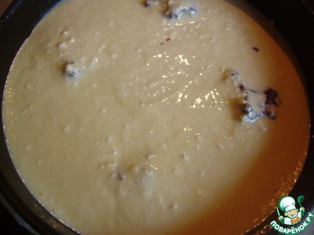 Белое тесто выкладываем в разъемную форму, смазанную маслом. А коричневое тесто выкладываем поверх горками. И пока откладываем.