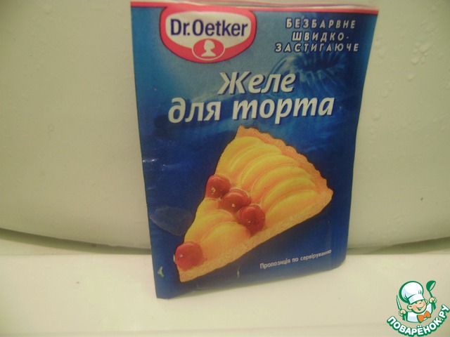 Теперь займемся желе. Я использую такое вот желе (в упаковке 8 г) и готовлю как указано на упаковке. Содержимое двух пакетов смешиваю с 4 ст. л сахара и постепенно вливаю в 500 мл воды. Довожу до кипения, и варю 1 минуту. Обычно я покупаю красное, но в этот раз в магазине не оказалось, так что для цвета добавила сок с вишен.