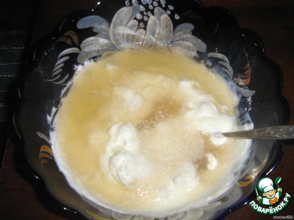 Творог смешать со сметаной и сахаром