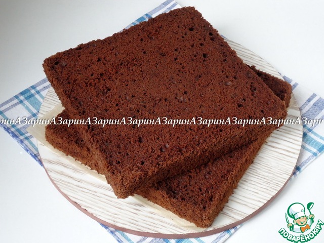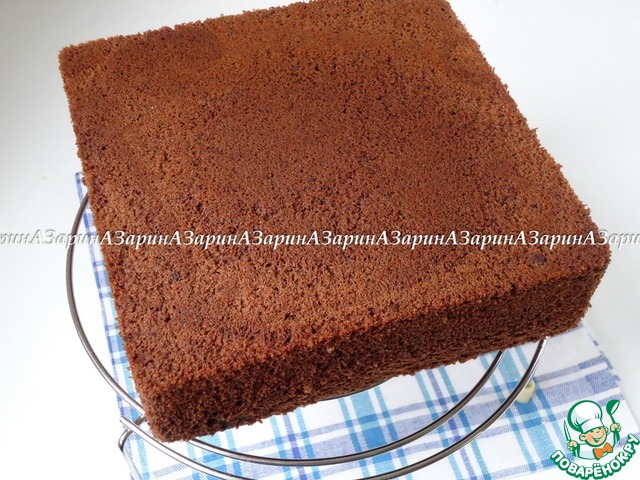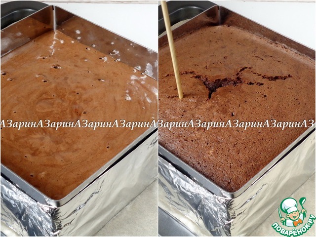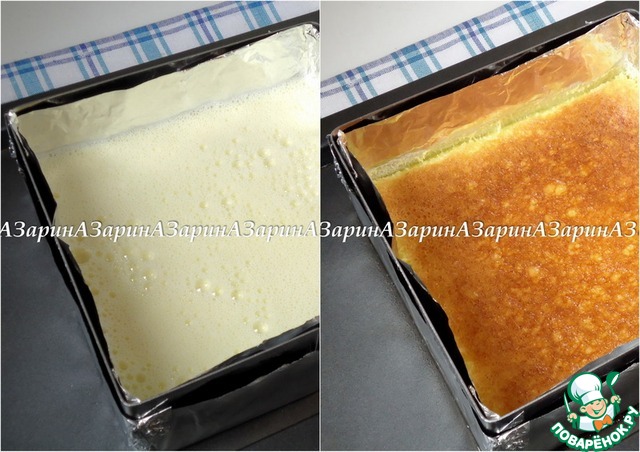 Вылить бисквитную массу в квадратную форму со стороной 18 см, ничем её не смазывая, лишь застелив низ пекарской бумагой. Выпекать в заранее разогретой духовке при 180°С 40 минут.