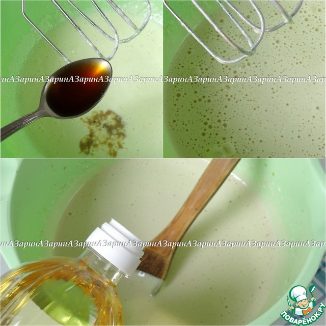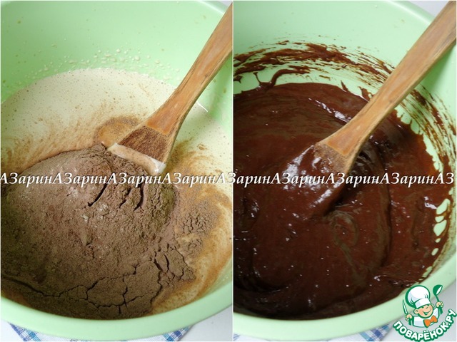 Сыпучие ингредиенты просеять в жидкую массу и аккуратно перемешать методом складывания снизу вверх.