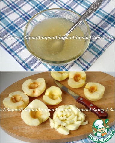 Для суфле желатин замочить в 130 мл воды. Яблоки очистить (нам потребуется 500 грамм очищенных яблок) и нарезать.