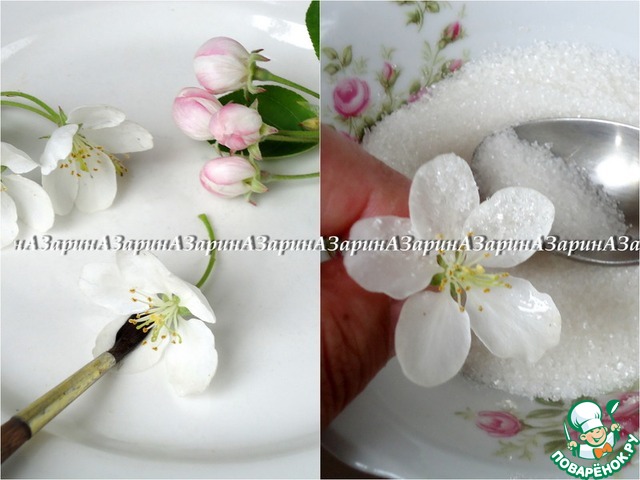 Для украшения, я использовала соцветия яблони, но это могут быть любые съедобные цветы. Белок немного взбить вилкой, что бы легче было обмакивать кисть. Поверхность цветов и листиков покрыть белком и тут же обсыпать мелким сахаром. Дать соцветиям подсохнуть.