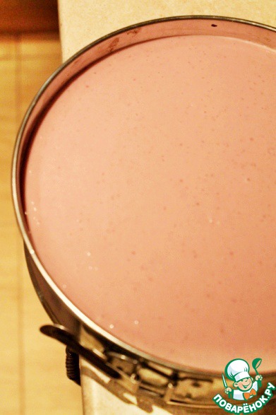 Бисквит охладить, перевернуть дном в верх, поместить в разъёмную форму. Пропитать любым сиропом. Сверху вылить малиновую массу. Поместить в холодильник примерно на 30-40 минут, за это время суфле "схватится".