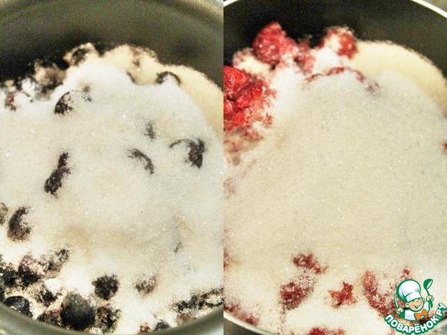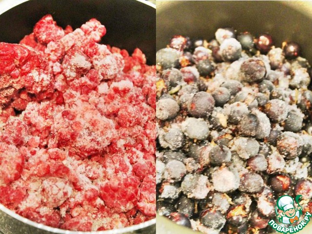 В малину добавить 6 ст. л. сахара, в смородину 4-5 ст. л. сахара. Довести до кипения и немного прокипятить.