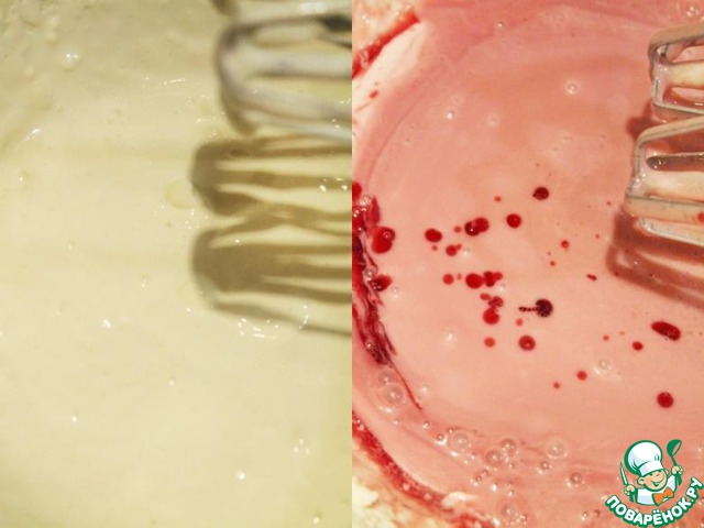 Сливки немного взбить, добавить творог (предварительно перетереть через сито или использовать творожную массу) и ещё взбить до однородности, затем добавить ягодную массу, в одну часть малиновую, во вторую смородиновую. То есть, у нас получится два мусса разного цвета.