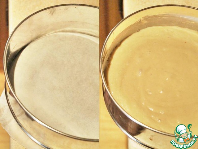 Форма для торта у меня 22 см. Дно застелить бумагой для запекания, стенки, при необходимости смазать маслом, перелить тесто для бисквита и запечь при 180 град до готовности (примерно 20 мин. но ориентируйтесь по вашей духовке), до сухой лучины.