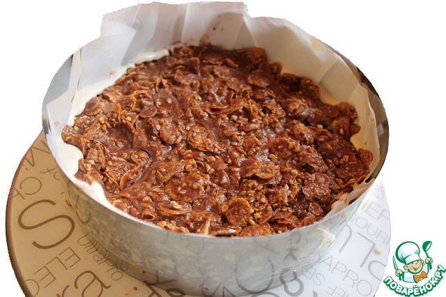 Далее нам нужно достать из морозилки наш кранч, снимаем его аккуратно с бумаги, переворачивая, кладем на мусс. У меня нет формы 24см, поэтому мне пришлось сначала положить бумагу, а потом все остальное. Я побоялась, что крем может вытечь.