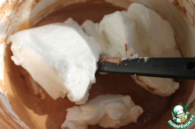 Далее нам надо взбить желтки (4шт) с сахаром (26гр) до увеличения в 3 раза. Затем смешаем желтки с растопленным шоколадом. И постепенно вмешаем белки. Перемешиваем все аккуратно лопаткой сверху вниз.
