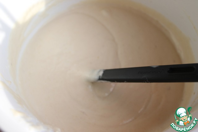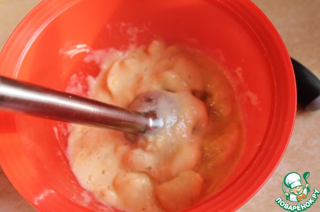Добавим банановое пюре и взобъем слегка. Желатин нам надо залить водой (50мл) заранее на 10-15минут. Дать ему набухнуть и затем распустить. Вмешаем 2 ст. л. ложки взбитых сливок в желатин, и выльем эту массу в банановую смесь. Затем, постоянно мешая ее, добавляем сливки.