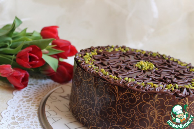 Верх я украшала шоколадом (50гр), растопленным со сливочным маслом (30гр). Все размешаем и наливаем в целлофановый мешочек, отрезаем уголок и можем рисовать. Сверху у меня рубленые фисташки. Это я не ставила в ингредиенты, тут уже ваша фантазия.