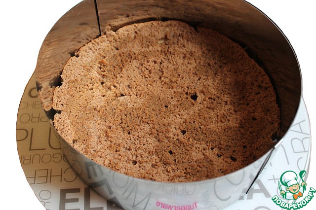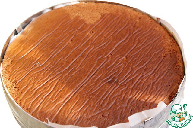Такой у меня бисквит получился. Очень нежный. Даем ему остыть, убираем кольцо и преворачиваем, так быстрее остывает.