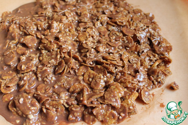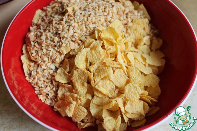 Делаем теперь кранч. Готовые хлопья для завтрака смешаем с рубленым фундуком. В сотейнике доведем до кипения сливки, добавим сливочное масло, все размешаем. Поломаем шоколад, добавим все в эту смесь и дадим шоколаду раствориться. Oстудим массу до комнатной температуры, размешаем ее с орехами и хлопьями.