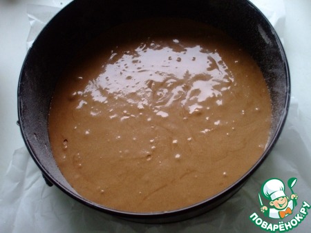 Вылить тесто в заранее подготовленную форму 22 см. На дно формы -пекарская бумага. Края -смазать маслом и присыпать мукой. Выпекать при температуре 170С в заранее нагретой духовке.