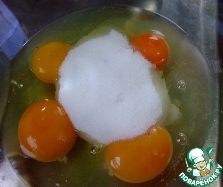 3 яйца, 2 желтка, 45 гр сахара, 15 гр ванильного сахара взбить на водяной бане до побеления массы и увеличения ее раза в 2-3. Сахар должен полностью раствориться.